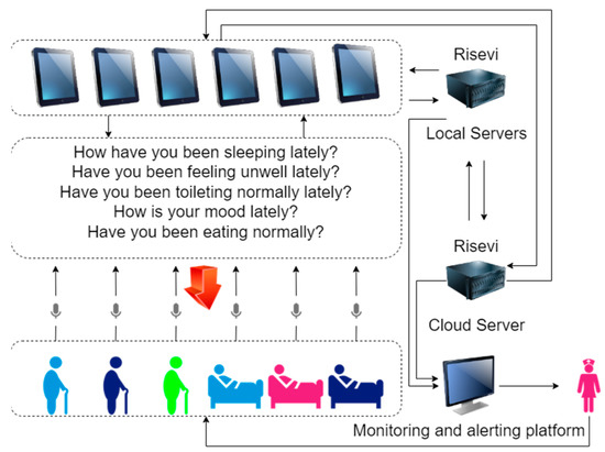 In Figure 1, a nursing home that has already used an information system is taken as an example to describe the application scenario of the Risevi model. The Risevi model will be deployed to the nursing home’s local server and cloud server, and the local server and cloud server are hot backups for each other. We use third-party speech synthesis technology to interact with the elderly in the nursing home through the voice of the tablet computer in the daily routine rounds. Every time the older adult replies, the voice file will be collected to the local and cloud servers. After the Risevi model deployed in the cloud server receives the voice files of the elderly, it will conduct relevant analysis and feedback on the analysis results to the health monitoring and alarm platform. Suppose the Risevi model deployed in the cloud server responds over time. In that case, the Risevi model deployed in the local server will feed the analysis results to the health monitoring and alarm platform. The health management personnel of the nursing home formulate a health management plan for each older adult by checking the health information content of each older adult in the health monitoring and alarm platform.