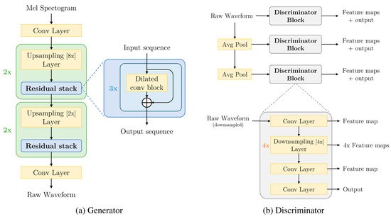 As shown in Figure 2 [50], MelGAN consists of a generator and a discriminator, and the Mel spectrogram is the generator’s input. After inputting the Mel spectrogram into the generator, it first passes through the convolutional layer. After passing through the convolutional layer, the upsampling layer, and the residual module, it finally outputs the audio. The discriminator adopts a multi-scale architecture. The discriminator analyzes not only the original audio file but also the original audio file after down-conversion using Avg pooling. MelGAN uses Hinge Loss as the model’s loss function, as shown in Formulas (1) and (2) [50].