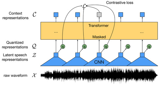 In Figure 4, represents an audio file. This framework uses a multi-layer convolutional neural network to encode into and then inputs into the Transformer network to build . The construction of is not discrete but based on continuous speech representations. Quantization is used for loss functions in contrastive tasks. The loss function used by the Wav2vec2 framework in the comparison task is shown in Formula (3) [53].
