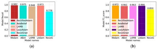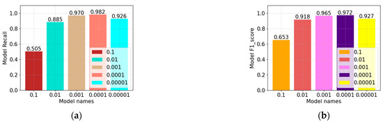 Comparison of recall and F1 scores for different learning rates. (a) comparison of recall rates. (b) comparison of F1 scores.