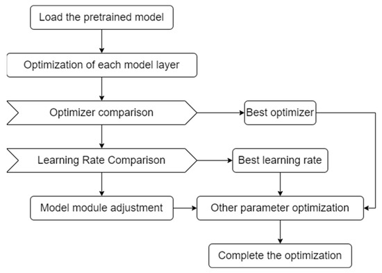 As shown in Figure 11, first load the pre-trained model; secondly, freeze all layers, unfreeze a layer, train a layer, and train each layer in this way; then, compare each optimizer and various learning rates; then the Encoder Block and MLP Block of the Transformer Encoder module in the ViT network model were fine-tuned; finally, other parameters in the model were optimized.