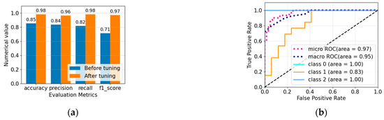 As can be seen from Figure 12a, the accuracy, precision, recall, and F1 score of the optimized model are all improved compared with those before optimization. It can be seen from Figure 12b that the AUC value of the optimized model is very close to 1.0.