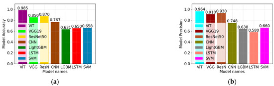 As can be seen from Figure 13, using Vision Transformer, VGG19, ResNet50, CNN, LightGBM, LSTM, and SVM as the basic models, the accuracy and precision of the feature classification models constructed, respectively, exceed 50%. As can be seen from Figure 13a, the accuracy rate using Vision Transformer is the highest. As can be seen from Figure 13b, the precision rate using Vision Transformer is the highest.