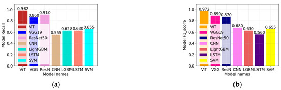 As can be seen from Figure 14, using Vision Transformer, VGG19, ResNet50, CNN, LightGBM, LSTM, and SVM as the basic models, the recall rate and F1 score of the feature classification models constructed, respectively, exceed 50%. From Figure 14a, we can see that the recall rate using Vision Transformer is the highest compared to that. From Figure 14b, we can see that the F1 score using Vision Transformer is the highest compared to that.