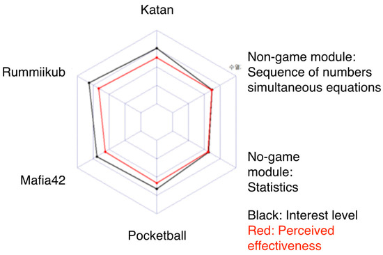 Not every class module introduces a game. Generally, class modules with games, such as Katan, Rummikub, Mafia 42, and Pocketball, received higher interest from participants. However, other courses without games, such as matrix, sequence of numbers, and simultaneous equations, received lower evaluation scores. Regarding effectiveness, there was no significant difference between classes with and without games. However, the effectiveness is slightly higher in modules with games.