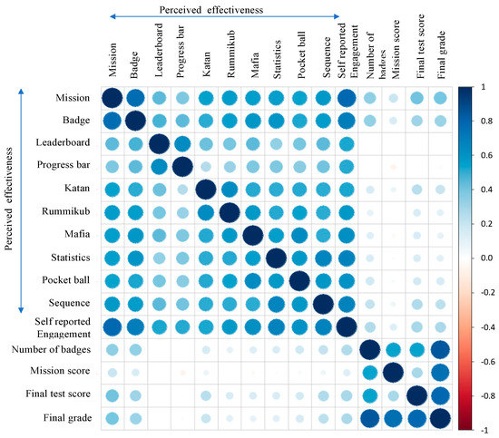 Finally, we investigated the relationship between achievement and other perceived effectiveness on game and gamification factors and achievement on gamification factors. Figure 3 shows the results. As we can see, the number of badges is mainly correlated to the final test score. The perceived effectiveness on mission points is ranked second. This is somewhat different from our previous finding that perceived effectiveness on badges was lower than on mission points.