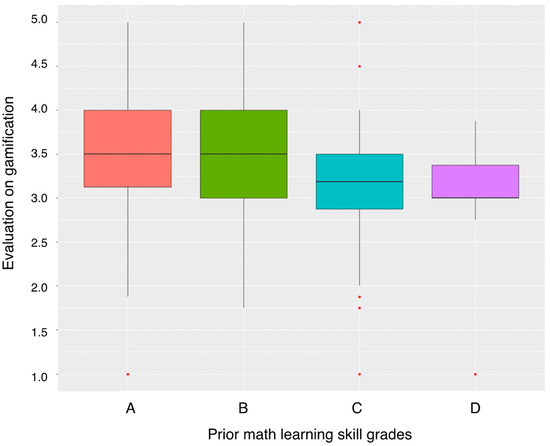 We analyzed the relationship between the evaluation of gamification and pre-mathematics grades among the four classes. There is a slight difference between the grades, but it is not statistically significant enough to be fairly applied to students of all levels. In contrast to the evaluation of gamification components, it was found that students’ grade achievements were significantly affected by their ability to study. In particular, higher-level students favor the “Yummy Mathematics” class. For students at high levels (A and B), gamification is very useful to motivate them. The results are shown in Figure 4. The components of gamification, such as badges, leaderboards, the progress of learning, mission, etc., are gears to encourage students who have been doing well. However, many students who hardly earn badges gave up the courses after the 5th or 6th week. More tools should be designed for lower-level students to participate in the class to solve this problem. These supplements will be reflected in the gamification methodology for teaching instructions for the next academic year.