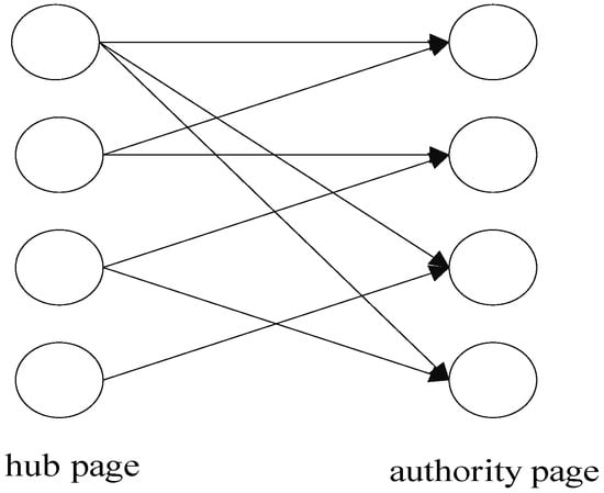 Kleinberg proposed the HITS algorithm for network search problems [], aiming at extracting information from link structure. In the algorithm, each web page has two attributes: hub value and authority value, which are recursively defined. Therefore, hub value and authority value show a mutually reinforcing relationship, as shown in Figure 1.