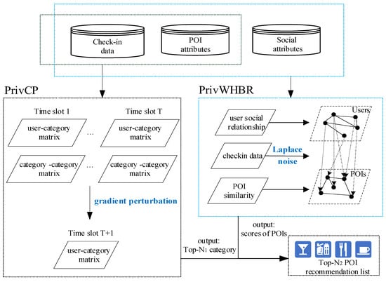 Therefore, next POI recommendation takes into account many contextual factors that are closely associated with the user’s behavior, including behavior patterns, time and geographical influences, etc. These factors are either discrete values (such as location transition patterns) or continuous values (such as geographical distance). Hence, next POI recommendation methods should be carefully designed to use these heterogeneous factors to predict user behavior in the next time interval. Furthermore, next POI recommendation methods are constructed on the basis of collecting user data, such as their relationships and the association between POIs and users. Third-party recommendation systems can extract sensitive user information and disclose their privacy for certain purposes. In addition, most recommendation models imply the personal information of users; for example, the latent feature matrix of the matrix factorization technique can directly infer users’ ratings on POIs. Therefore, next POI recommendation systems also face a high risk of privacy disclosure [,].