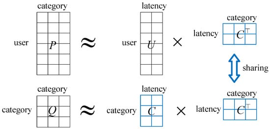 As can be seen from Figure 3, the category latent feature matrix is shared by the user–category matrix and category–category matrix and plays a connecting role. Therefore, the number of user visits to categories and the transition patterns between categories will be integrated into the learning process.
