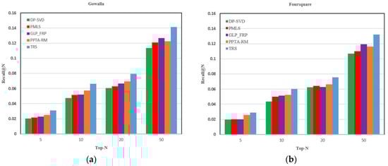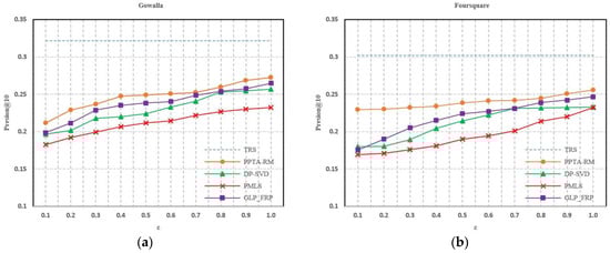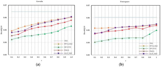 As can be seen from Figure 6, except for the DP-SVD method, the other three privacy-preserving methods maintain similar recall values. From the view of recall, when , the GLP_FRP method is slightly better than the PPTA-RM method for the Gowalla dataset. When , the GLP_FRP method is slightly better than the PPTA-RM method for the Foursquare dataset, but when , the PPTA-RM method has a higher recall value, which also indicates that the PPTA-RM method can maintain high recommendation quality when the privacy budget is small.