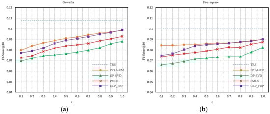 The F1-Score comparison of the above methods is shown in Figure 7. Since the user’s check-in data are sparse, this has a certain impact on F1-Score. The F1-Score of each privacy-preserving method grows as the privacy budget increases. With the exception of the F1-Score of the GLP_FRP method being very slightly higher than that of the PPTA-RM method when the privacy budget is 1, the F1-Score of the PPTA-RM method is better than the other three privacy-preserving methods as a whole. Compared with the DP-SVD, PMLS, and GLP_FRP methods, the PPTA-RM method improved the F1-Score@10 on the Gowalla dataset by 10.4%–15.6%, 5.8%–10.9%, and 0.4%–5.6%, respectively, and improved the F1-Score@10 on the Foursquare dataset by 8.3%–21.8%, 2.8%–12.5%, and 0.8%–11.2%, respectively.