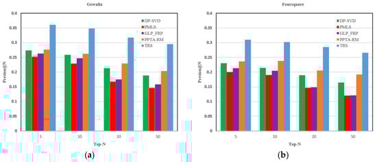 As shown in Figure 8, the precision values of both the PPTA-RM and DP-SVD methods at and are significantly higher than that of the PMLS and GLP_FRP methods for these two datasets, implying that these two methods can maintain better recommendation accuracy when the number of POIs recommended is large. A possible reason may be that matrix-factorization-based methods are better at dealing with sparse check-in data.