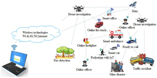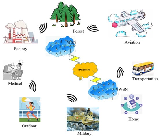 IoT refers to a network that connects any item to the Internet through information sensing devices, under agreed protocols, for autonomous information exchange, and provides useful information for people to achieve intelligent identification, positioning, tracking, monitoring, and management of things [1,2]. IoT is considered the world’s next wave of information technology and new economic engine, which will have an immensely significant impact on the world economy, politics, culture, military, and society. IoT provides the potential for the development and design of a large number of applications. Currently, only a few applications have been promoted in our production and daily life. At present, most applications only have relatively primitive intelligence, but in the future, there will be many applications based on the IoT to improve our quality of life and production environment. The intelligent objects in these applications can communicate with each other, perceive information from the surrounding environment, and be deployed in various environments, including transportation and logistics, healthcare, production and life, and personal social media [3,4,5,6], as shown in Figure 1.