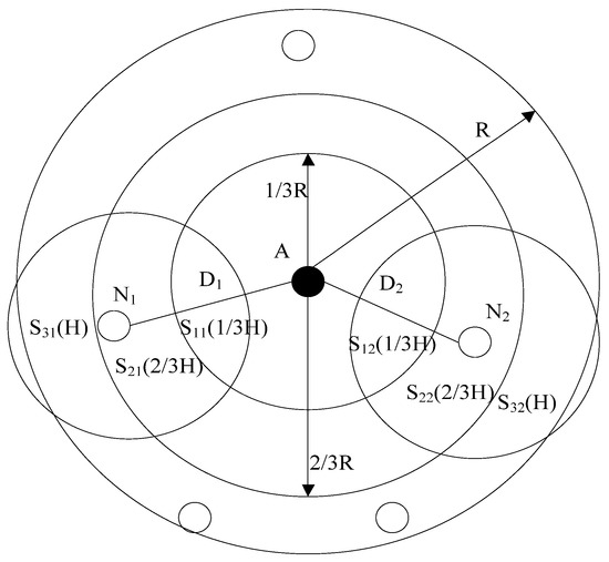 Assuming that nodes are unevenly arranged in an area with a total number of nodes and area , the nodes in each subarea are denoted as , and . Assume , , and are the estimated areas of each region, calculated as shown in Equations (7)–(9).