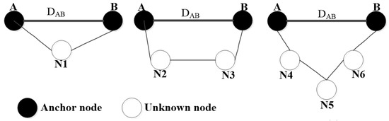 The unknown node only receives from the closest anchor node and calculates its distance between it and anchor nodes. For example, unknown node first receives , and the range between it and is: