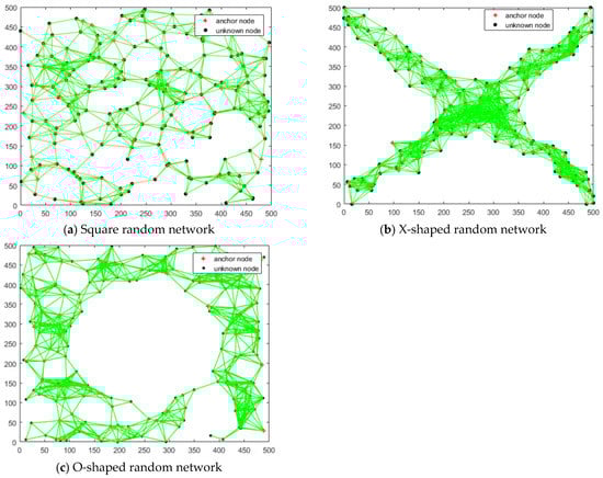 To diminish the influence of stochastic errors on the results in the tentative experiment, the final result is the mean of 100 tentative experiments to evaluate the localization accuracy and localization error of every way. Three distinct network topologies were chosen, as shown in Figure 12. Namely, square random, O-shaped, and X-shaped. Square random is one of the most used topologies in WSN, in which nodes are stochastically distributed in square regions. The O-shaped topology is an irregular network topology, while the X-shaped topology is also based on the random deployment of nodes in the four sides empty area. For each topology, the system parameters are set as shown in Table 1. The network deployment area is a two-dimensional plane of 500 m × 500 m. All nodes with the same structure and communication radius are randomly arranged to form a self-forming network.