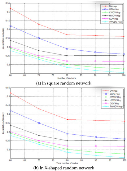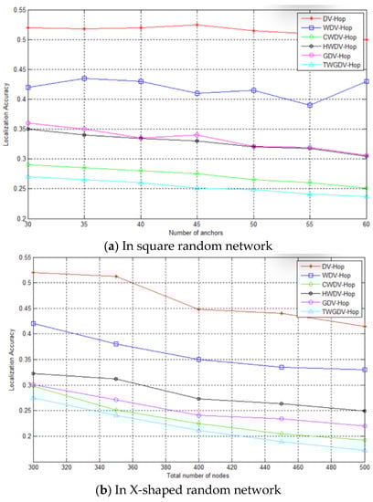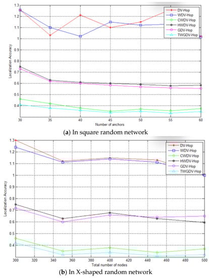 Typically, the trend of LA of most localization algorithms diminishes little by little along with the number of anchors added in the three networks. The LA of DV-Hop, WDV-Hop, CWDV-Hop, HWDV-HopPSO, GDV-Hop, and TWGDV-Hop is approximately 0.52R, 0.42R, 0.27R, 0.32R, 0.34R, and 0.25R, respectively. Compared with other algorithms, the proposed TWGDV-Hop achieves a lower localization error. The localization accuracy of TWGDV-Hop algorithm has been improved by approximately 51.6%, 39%, 7%, 23%, and 24%, respectively. The localization accuracy of DV-Hop, WDV-Hop, CWDV-Hop, HWDV-HopPSO, GDV-Hop and TWGDV-Hop is approximately 1.01R, 0.62R, 0.61R, 0.72R, 0.62R and 0.59R, respectively, in the X-shaped network, and the LA of TWGDV-Hop has been improved by approximately 42.2%, 9.4%, 4.7%, 18.9% and 5.8%, respectively. The localization accuracy of DV-Hop, WDV-Hop, CWDV-Hop, HWDV-Hop, GV-Hop and TWGDV-Hop is approximately 1.15R, 1.11R, 0.39R, 0.62R, 0.60R and 0.36R, respectively, in the O-shaped network, and the localization accuracy of TWGDV-Hop has been improved by approximately 68.6%, 67.6%, 6.9%, 41.9% and 40.2%, respectively.