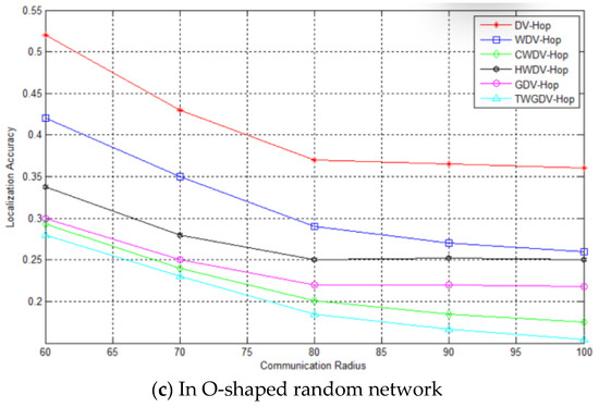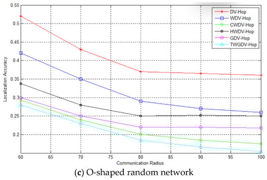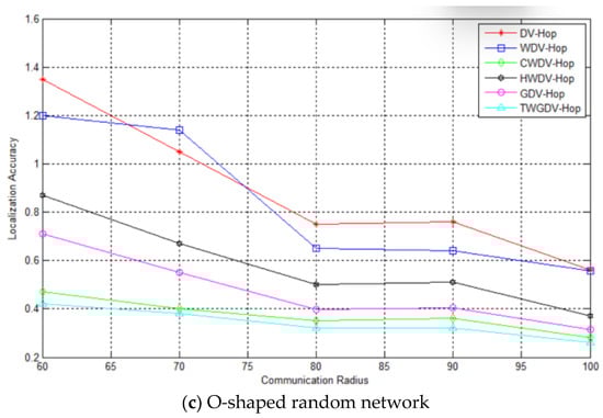 The whole number of nodes is fixed at 300. The proportion of anchor nodes is 10% and the communication radius has been increased from 60 m to 100 m. The results are presented in Figure 13c, Figure 14c and Figure 15c. The results show that as the network becomes more connected, the localization errors of the three networks decrease with communication range growing. In the square network, compared with the other algorithms, the LA of TWGDV-Hop has been improved by 50.3%, 36.1%, 7.2%, 25.8% and 15.9%, respectively. In the X-shaped random network, the LA has been improved by 38.9%, 4.3%, 2.4%, 9.3% and 5.1%, respectively. In the O-shaped network, the LA has been improved by 61.9%, 59.4%, 8.5%, 41.7%, and 28.4%, respectively.