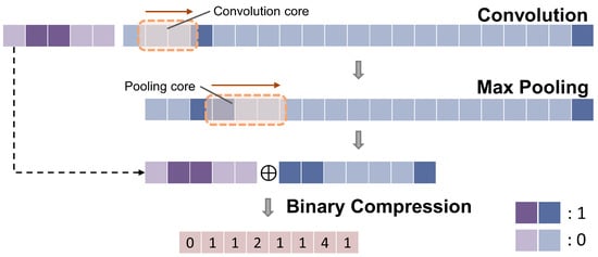 As shown in Figure 5, the value part of each is calculated by the convolution core, from the first dimension to the last with step = 3. Then, the data feature is calculated by the max pooling core, also from the first dimension to the last with step = 3. After max pooling, the size of the data feature will be 1/ of the original feature. At last, the data feature is further compressed by a binary compression operation . It compresses all continuous zero bits into a single bit with the value representing the number of zero bits. Thus, the compression rate depends on the sparsity of the data feature and is marked as . The size of the final data feature will be close to / of the original feature size.