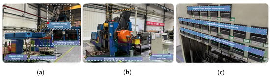 The production line consists of four processes—smelting, upward casting, rolling, and extruding—as shown in Figure 10a,b. The IIoT sensors are distributed among these processes to acquire real-time manufacturing data, like temperature, voltage, power, viscosity, etc. As an example, Figure 10c shows a series of crystallizer water temperature sensors for the melting process. However, anomalies that happen during the melting process cannot be obviously detected because workers cannot always keep their eyes on these sensors to observe anomalies.