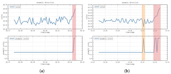 Moreover, a representative anomaly detection is presented in Figure 13. In Figure 13a, the temperature values fluctuate reasonably in a range with no anomalies. Correspondingly, the system continuously reports a stable and relatively low anomaly probability (close to 0.2), which means there are no anomalies that can be reported. However, at 02:42:15, a series of abnormal values is increasing, which causes the system to report high-confidence anomalies. In Figure 13b, at 14:31:05, there are abnormal values that are decreasing, which also lead to reporting an anomaly. But, according to the site working report, this is not a true positive anomaly, which means the system has reported a wrong anomaly.