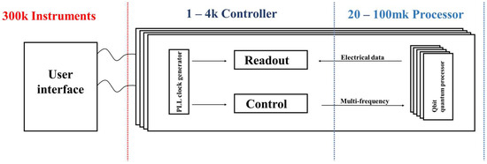 Existing quantum computers consist of several similar parts containing both a quantum processor and a classical electronic controller. In this case, the quantum processor consists of one or more quantum bits [5,6,7], which need to be at a very low temperature to exhibit quantum properties; usually this temperature is a few tens of millikelvin. But a quantum processor alone cannot work properly. Quantum processors need an external input control signal to make them rotate on a Bloch sphere, i.e., a quantum operation, and a set of circuits to read the result after the quantum operation. Therefore, a quantum computer needs a classical electronic controller to do the above work [8]. The existing classical electronic controllers for quantum computers are usually implemented by instruments at room temperature [9,10]. But as the number of quantum bits grows, controllers at room temperature cannot meet the demand for controlling large-scale quantum processors. So integrated circuit controllers based on cryogenic CMOS (Cryo-CMOS) circuits operating at temperatures below 4 Kelvin are proposed [11,12,13,14]. Controller circuits operating at ultra-low temperatures can provide larger system-on-a-chip integration to support higher numbers of quantum bits, significantly reducing the connection between low-temperature and room-temperature electronics. And the resulting high level of integration will pave the way for future practical quantum computers. The classical quantum computer architecture is shown in Figure 1, which can be divided into three parts based on temperature: a quantum processor part operating at a few tens of millikelvin, a quantum controller operating at 4 Kelvin, and a control device operating at room temperature to interact with the operator.