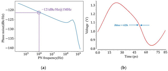 The phase-locked loop is designed in a 28 nm process; the layout is shown in Figure 2, the area is 0.35 mm2, and the power consumption of the phase-locked loop is 7 mW. To compensate for the 20% frequency rise at low temperature, the phase-locked loop is locked at 10 GHz in the simulation. The phase noise is shown in Figure 3a as −121 dbc/Hz@1 MHz and the jitter is shown in Figure 3b as 62 fs.