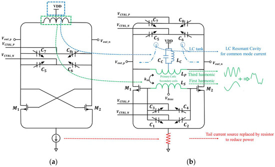 Compared to the conventional LC oscillator in Figure 4a, the F-CLASS VCO proposed in this paper is shown in Figure 4b, where the parts making improvements are marked by colored lines and analyzed in detail in the following.