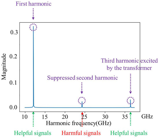 According to the conclusion of [33], in order to further suppress the second harmonic, the oscillator proposed in this paper also introduces an LC tank at the power supply input to provide an LC Resonant Cavity at the second harmonic and the common mode current. This LC tank is directly connected to the taps of the primary coil, which can effectively suppress the effect of the second harmonic. The third harmonic excited by the transformer and the second harmonic suppressed by the resonant cavity at the power supply result in a significant increase in the oscillator output spectrum at the fundamental and third harmonics and a significant suppression at the second harmonic, as shown in Figure 5.