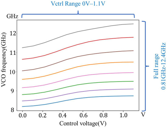 In order to support the operation of as many quantum bits as possible, the quantum computer uses Frequency Division Multiple Access (FDMA) to control different qubits by means of different frequencies output from one controller, and there is usually a large frequency interval between each frequency of FDMA. Also, because the frequency of the VCO increases significantly at low temperatures, the VCO needs a large tuning range in order to balance the inaccuracy of the frequency at low temperatures with the bandwidth requirements of multiple qubits. To meet the requirement of frequency, the VCO in this paper uses multiple tuning capacitor arrays to expand the tuning range. The tuning range of the VCO is shown in Figure 6.