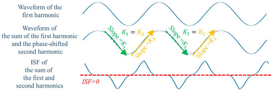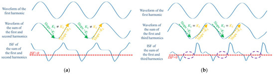 (a) Fundamental waveforms, fundamental and second harmonic synthesized waveforms, ISF of synthesized waveforms. (b) Fundamental waveforms, fundamental and third harmonic synthesized waveforms, ISF of synthesized waveforms.