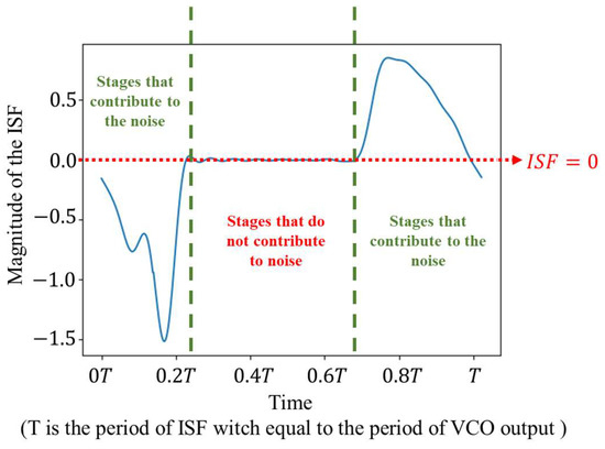 According to [34,35], the phase noise contributed by the flicker noise can be written as in (9), where is the unnormalized ISF, is the flicker noise, and and are constants. According to the equation, we can conclude that, in addition to the flicker noise itself, the shape of the ISF significantly affects the phase noise contributed by the flicker noise. The phase noise is proportional to the integration of the product of ISF and flicker noise re-squared, so if you want to keep the oscillator phase noise as low as possible, a straightforward idea is to keep the ISF at zero as much as possible, so that the phase noise obtained from the integration will be as small as possible.