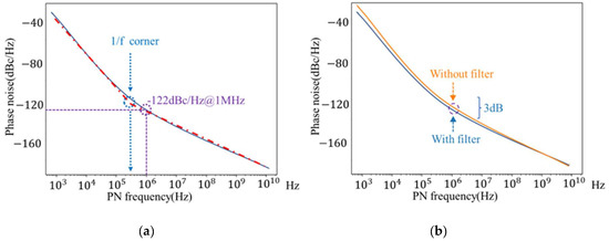 Through the derivation and analysis above, this paper explains the fundamentals of the designed oscillator to improve the phase noise by two methods: enhancing the third harmonic by F-CLASS VCO and changing the common-mode path by power supply filter. The ISF of the oscillator is also simulated in this paper, as shown in Figure 10. It can be seen that a relatively large portion of the ISF in the figure is 0, which does not enhance the flicker noise to phase noise. The corner frequency of the oscillator in this paper is shown in Figure 11a. It can be seen that the optimized corner frequency in this paper is about 200 KHz, which is significantly lower compared with the two unoptimized VCO structures in the paper [36], and the comparison of the corner frequencies of the three VCOs is shown in Table 1. In this paper, we have also simulated the oscillator with and without the power filter in the same oscillator structure. The phase noise of the oscillator with and without the power filter in the same oscillator structure is also simulated in this paper, as shown in Figure 11b. It can be seen that the phase noise of the oscillator with the power filter has a decrease of about 3 db. The above evidence shows that both the F-CLASS VCO structure and the power supply filter used in this paper can improve the noise performance of the oscillator very well.