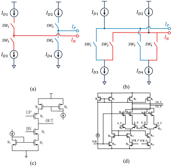 For a charge pump, its output current is the drain current of the MOS device that serves as the power supply. In order to analyze the effect of device mismatch on the current mismatch of the charge pump, we need to simplify the circuit of the charge pump to a logic structure that is only affected by the drain current. Figure 12c shows the differential charge pump composed of the classical charge pump structure, and Figure 12d shows the full differential charge pump structure proposed in this paper. In Figure 12a,b, correspond to the drain current of the MOS device which plays the role of current source in the circuit, and correspond to the four control switches of the charge pump, respectively. And correspond to the differential currents output from the charge pump. Each output current of the charge pump has three states, namely, pump-in current, pump-out current, and neither pump-in nor pump-out current. The charge pump dynamically pumps in or out current to adjust the control voltage of the VCO when the phase-locked loop is not locked. Its current mismatch is not significant in this process. When the phase-locked loop is locked, the discriminator no longer controls the charge pump; the charge pump at this time, in the ideal state, is neither pumped in nor pumped out current. But at this time, the charge pump current mismatch will cause continuous leakage, seriously affecting the stable state of the phase-locked loop. We can write out the classical charge pump structure and the full differential charge pump structure in the phase-locked loop locked when the charge pump is neither pumped in nor pumped out of the current mismatch.
