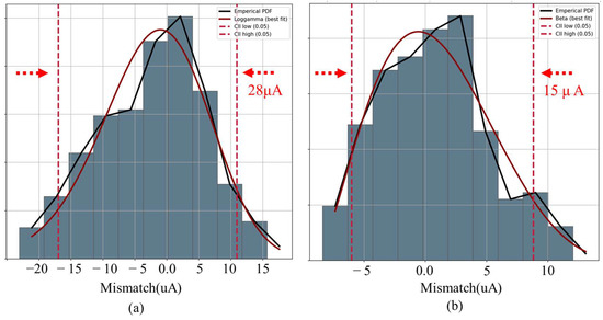 In this paper, the accuracy of the above proof is verified by Monte Carlo simulation, as shown in Figure 13. The mismatch simulation results of the classical charge pump are fitted as in Figure 13a. The mismatch simulation results of the fully differential charge pump are fitted as shown in Figure 13b. It can be seen very clearly that the fitted plot of the mismatch for the fully differential charge pump is much narrower than the fitted plot of the mismatch for the classical charge pump. It means that σ has been significantly reduced.