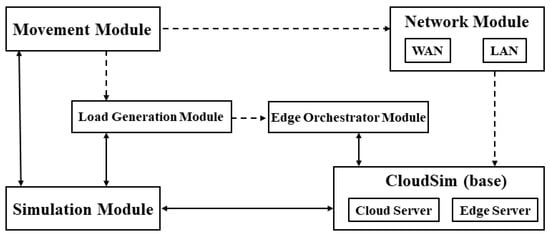 To verify the performance of the proposed method against existing baselines, we utilized EdgeCloudSim [], an open-source tool based on CloudSim that provides a simulation environment tailored to edge computing scenarios. The present study introduces a novel Q-learning-based load-balancing approach, which is implemented within the framework of an edge orchestrator module, as depicted in Figure 1. This module serves the purpose of load allocation between cloud servers and edge servers. EdgeCloudSim enables experiments to be conducted considering both computing and networking resources, allowing for a comprehensive evaluation of the proposed method.