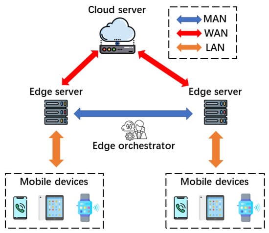 The communication environment used in the simulation is illustrated in Figure 2. The wireless LAN (Local Area Network) connects the devices to the edge server, while the devices are connected to the cloud server via WAN (Wide Area Network). The simulation includes multiple edge servers, and the servers located in different areas are connected by the Metropolitan Area Network (MAN). However, this paper does not consider the load-balancing among the edge servers, so it does not significantly impact the simulation results.