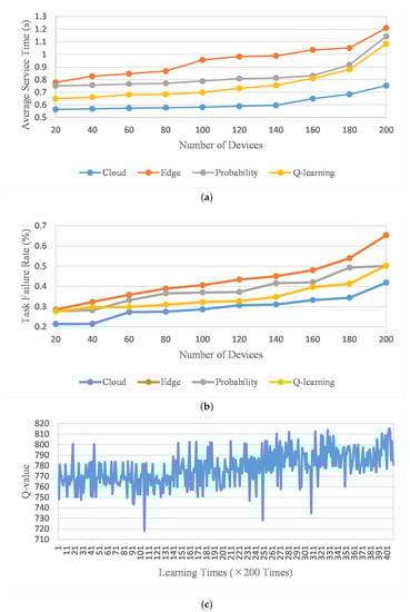 When the number of devices is from 20 to 200: (a) The comparison of average service time. (b) The comparison of task failure rate. (c) The change of Q-value.