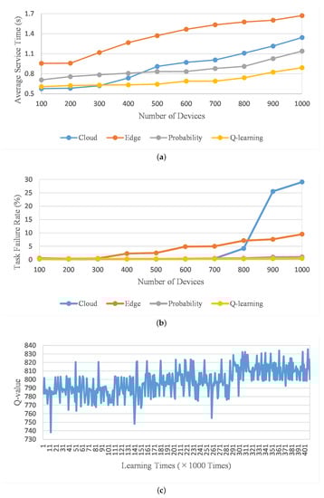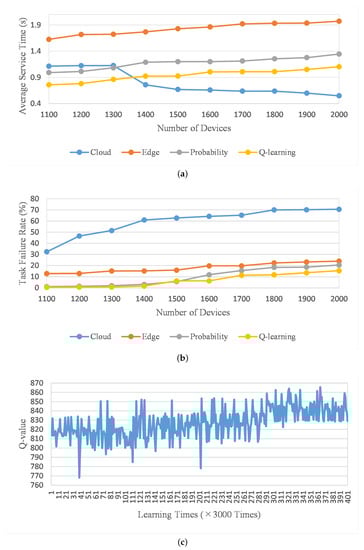 When the number of devices is from 1100 to 2000: (a) The comparison of average service time. (b) The comparison of task failure rate. (c) The change of Q-value.