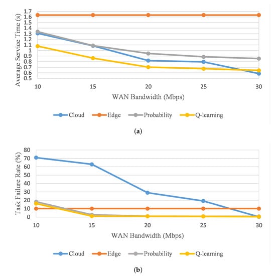 Change in WAN bandwidth: (a) The comparison of average service time. (b) The comparison of task failure rate.