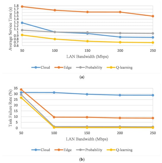 Change in LAN bandwidth: (a) The comparison of average service time. (b) The comparison of task failure rate.