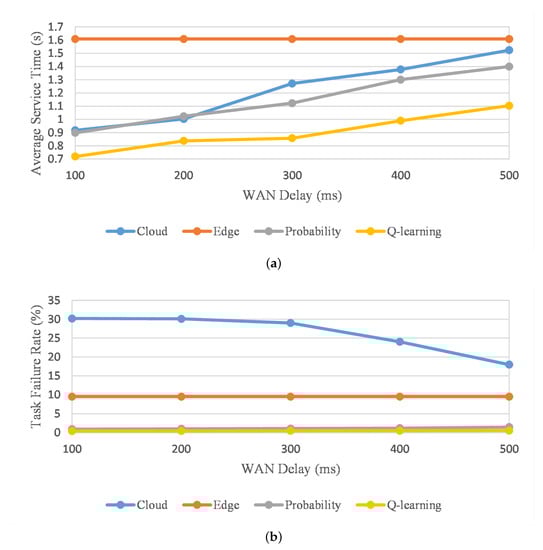 WAN communication delay: (a) The comparison of average service time. (b) The comparison of task failure rate.