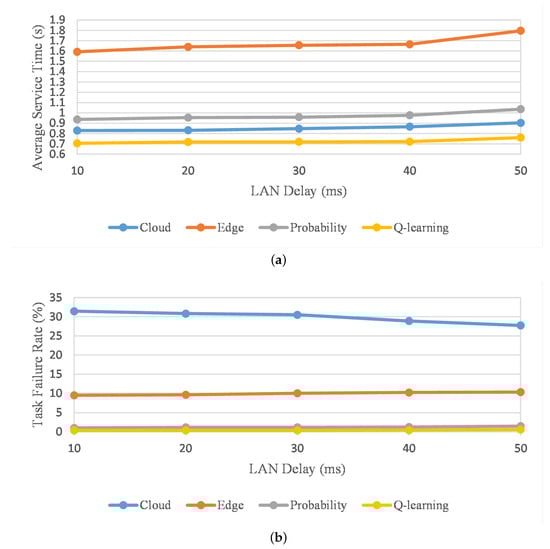 As seen from Figure 9, increasing the LAN communication delay increases the average service time for all methods. Since the LAN is always used for communication in any method, it is impossible to avoid an increase in the average service time as the communication delay of the LAN increases. In particular, the edge method, which uses only LAN for communication, has a remarkable effect. However, the increase in average service time for the other three methods is small. The reason for this is that the advantage of using edge computing is that it reduces communication delay and can be used for applications that require real-time performance. Therefore, it is shown that the change in LAN communication delay has almost no effect on average service time and task failure rate. Also, from the Figure 9b, the task failure rate is slightly reduced only for the cloud method. The reason for this is considered to be the same as that mentioned at the end of the previous section.