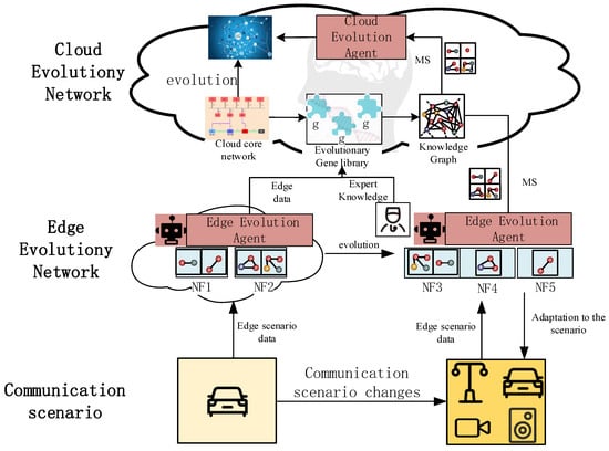 At the bottom-layer of the architecture, there are multiple ECNs designed for various application scenarios. Each ECN is equipped with its own evolving agent, which receives edge data, such as the signaling throughput, the distribution of various signaling types, and quality of service (QoS) of UEs and is responsible for making decisions about how to evolve its host ECN. Specifically, the edge agent learns how to use the genes from the global gene library,