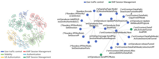 Figure 7, we present an experimental example of six clustered microservices, along with the corresponding nodes and edges in the user traffic control microservice. It is evident that the extracted microservices, such as AMF Session Management, Authentication, and SMF Session Management, are highly coherent with the function requirements of current 5G core network NFs, including AMF, SMF, and AUFS. This suggests that the clustering strategy on the calling graph of the core network is desirable for achieving the goal of gene generation.