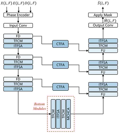 In previous research conducted by [15], it has been proven that FD and FU modules are successful in extracting information at different scales. In the encoder, FD gradually reduces the spatial size of the input and extracts more abstract and advanced information from the signal. In the decoder section, FU restores the spatial details of the signal and combines the previously extracted high-level information with low-level information to transmit more contextual information and enhance the DNN’s ability to recover details. Inspired by their works, we integrate FD and FU modules into our MSTFUNet. Moreover, to enhance the network’s ability to capture time-frequency information, we introduce TFCM, and ITFSA components at each scale.