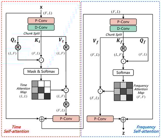 The calculation process for both time self-attention and frequency self-attention is similar, but there are differences in the size of the frequency self-attention calculation process and the absence of mask usage. The process of entire calculating frequency self-attention is expressed as: