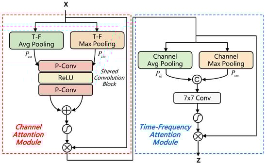In the time-frequency attention module, the output from the channel attention module is fed into an average and a max pooling layer to capture channel information of the speech. This aggregation results in and , respectively. Then, the concatenation of and is passed through a 7 × 7 convolution layer and subsequently a sigmoid layer. The output of the time-frequency attention module is as follows