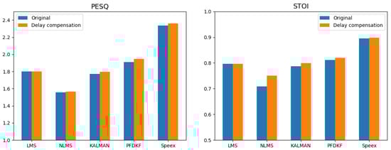 Based on the results presented in Table 3, it is clear that after the delay compensation, the Speex algorithm continues to demonstrate the most effective acoustic echo cancellation performance. Compared with the unprocessed audio, PESQ is increased by 0.556 and STOI is increased by 0.101. Figure 6 provides a more intuitive comparison of the performance of various adaptive filters before and after delay compensation.